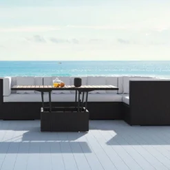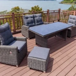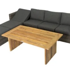 Das Gestell aus robustem Grandis-Hartholz macht die Möbel extrem haltbar. Dieses wird nach der Trocknung gebürstet und in Teakfarbe eingefärbt. Das Fishbone-Geflecht ist nicht nur weich sondern auch outdoortauglich, da es aus reißfesten und wasserabweisenden Polyäthylenfasern besteht. Die Loungegruppe hat ein Stellmaß von ca. 218 x 218 cm und besitzt zusammen mit dem Tisch ein Gesamtgewicht von nur ca. 60 kg.