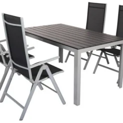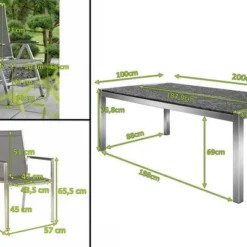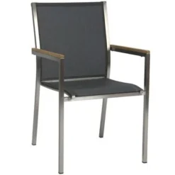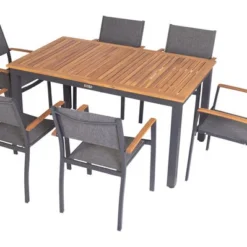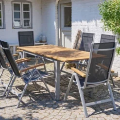 STERN Polaris Esstischgruppe, Silbergrau, Edelstahl/FSC-Teak, Tisch 220/340 X 100 Cm, 6 Stapelsessel