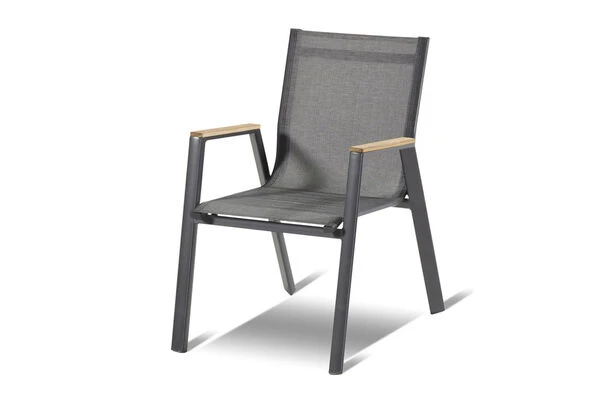 - Stapelbarer Sessel mit xerix-farbenem Aluminium und FSC®-Teakholz Armlehnen