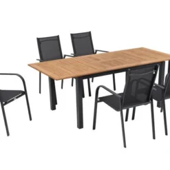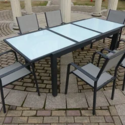 Bei dieser Esstischgruppe treffen hochwertige Materialien und Design auf modernste Weise aufeinander. Das Set besteht aus einem innovativen Ausziehtisch mit den Maßen von ca. 140/210×70 cm und 4 Stapelsesseln der Marke Kettler aus der Serie „Basic Plus Padded“.