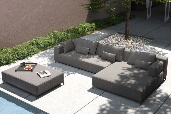 Die gemütliche Loungegruppe besteht aus 4 Elementen (1x 2-Sitzer-Element mit Armlehne, 1x große Recamiere, 1x Armlehne für Recamiere und 1x Hocker). Sie bestimmen, wie sie die Möbel auf Ihrer Terrasse am besten präsentieren. Die grauen Töne (Stoffbezeichnung senda grafito 1029) verleihen den Möbeln einen besonderen Charme. Das Obermaterial besteht aus hochwertigem, abriebfesten Agora Textilen (100% Polyacryl). Das Basismaterial ist spinndüsengefärbtes Acryl, bei dem bereits bei der Herstellung Farbpigmente in die Faser eingebettet werden. Der Stoff ist wasserabweisend beschichtet und mit speziellen Quellnähten ausgestattet – dadurch ist das Gewebe UV- und witterungsbeständig. Durch ihre absolute Wetterfestigkeit können Sie Möbel aus Agora ganzjährig ohne Schutz auf Ihrer Terrasse stehen lassen – und auch verschüttete Getränke oder dreckige Schuhe machen dem Stoff nichts aus. Auch in puncto Farbechtheit ist Agora ein Top-Material, die Farbe sieht auch nach Jahren in Gebrauch noch aus wie neu. Außerdem weist der Stoff atmungsaktive, schmutzabweisende und schimmelbeständige Eigenschaften auf, weshalb er sich hervorragend für den Innen- und Außenbereich eignet. Das Innere des Polsters besteht aus besonderem Schaumstoff – dem „Quick Dry Foam“. Dieses Material verfügt über eine offenporige Zellstruktur, welche mit der Funktion einer Drainage vergleichbar ist. Eingedrungenes Wasser kann ungehindert austreten und unangenehme Gerüche sowie Schimmelbildung werden vermieden. Je nach Beanspruchung und Umwelteinflüssen empfehlen wir, die Agora Möbel einmal im Monat mit einem Wasserschlauch oder einer sanften Bürste von oberflächlichen Verschmutzungen zu befreien.
