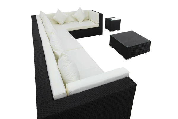 Mit acht Sitzplätzen ist diese Loungegarnitur ein wahres Prachtexemplar und bietet besonders hohen Sitzkomfort dank seiner ca. 10 cm dicken Polstern, welche mit wasserabweisenden Bezügen aus 100% Polyester (300g/m²) geschützt sind. Die verwendete flache und schwarze Polyrattanfaser ist pflegeleicht und sehr wetterfest. Sie trotzt extremen Temperaturen zwischen -60°C bis +70°C genauso wie Chlor, Salzwasser und UV-Strahlen. Im Inneren befindet sich ein rostfreies Aluminiumgestell, welches für die nötige Stabilität sorgt und aufgrund des geringen Gewichts einen einfachen Platzwechsel ermöglicht. So erweist sich diese wertbeständige Polyrattan Gartenlounge als langlebiger Begleiter.