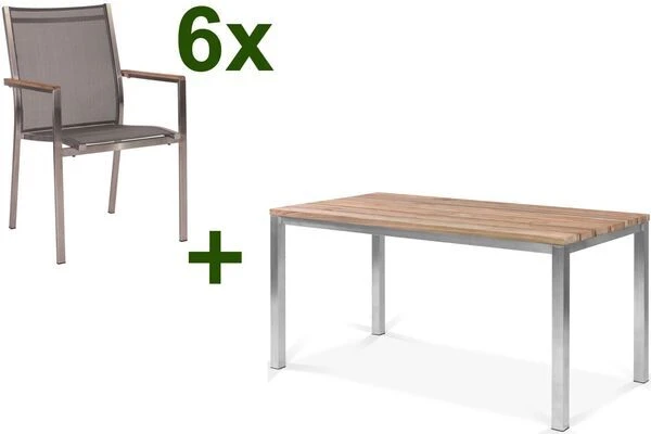 STERN Cardiff Esstischgruppe, silber/silbergrau, OUTFLEXX Esstisch, silber/natur, Edelstahl/ recyceltes FSC®-Teakholz, 6 Stapelsessel