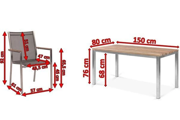 Die Kombination aus edlen, zeitlosen und rustikal, gemütlichen Elementen macht diese Esstischgruppe so besonders. Das Set besteht aus einem Esstisch der Marke OUTFLEXX mit den Maßen von ca. 150 x 80 x 76 cm und 6 Stapelsesseln der Marke Stern aus der Serie „Cardiff“. Die hellen Farben des Gestells sind in Verbindung mit der Farbe des Teakholzes ein echter Hingucker und sorgen für eine zeitlose Frische. Dadurch lässt sich die Esstischgruppe wunderbar mit anderen Farben kombinieren. So bleibt Ihnen viel Raum für kreative Gestaltungsmöglichkeiten. Die hochwertigen Materialien und die sorgfältige Verarbeitung sorgen nicht nur für die besondere Optik dieser Esstischgruppe, sondern machen sie auch sehr stabil.